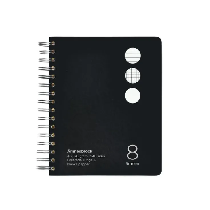8-ämnesblock i A5-format. Blocket har 240 sidor, Omslag i kartong och åtta avdelare med synlig flik i kartong. Sex av avsnitten har linjerade blad, resterande två har rutade respektive blanka blad.70 g linjerat, rutat och olinjerat papper.Miljömärkt.Ett anteckningsblock i smidigt format som lätt ryms i väskan. Passar perfekt för elever med många ämnen att hålla reda på samtidigt. Ingår i Akademibokhandelns egen kollektion – Kollektion Stora A.