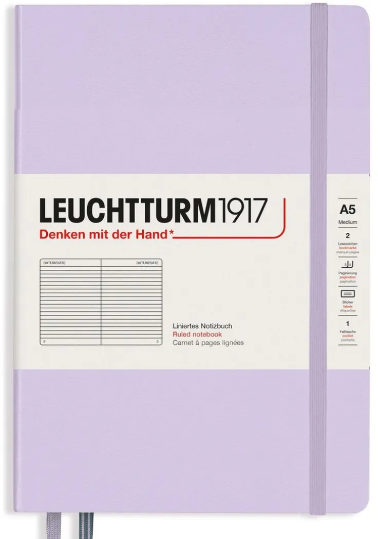 Notebook från Leuchtturm1917 – en anteckningsbok i praktiskt A5-format med 251 linjerade och numrerade sidor varav 8 sidor är perforerade och löstagbara. FSC-certifierat och ink-proof (80g) papper. Märkband och förvaringsficka. Resårband runt boken. Självhäftande etiketter för märkning och arkivering. Färg: Lilac