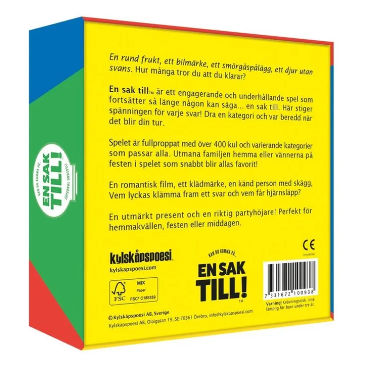 EN SAK TILL – Ett pojknamn som slutar på n. En svensk schlagerlåt. Ett djur utan svans. Något som gör ont. Ett klockmärke. Hur många tror du att du klarar? Spelet fortsätter så länge någon kan säga… en sak till! En sak till är ett medryckande och engagerande spel med över 400 kul och varierande frågeteman – enkelt utan massa krångliga regler! I varje runda dras ett tema, som till exempel en rund frukt eller ett smörgåspålägg. Nu gäller det att hela tiden säga en sak till när man står på tur att svara. Vem håller sig kvar längst och vem får hjärnsläpp? Här stiger spänningen snabbt för varje svar! En sak till är ett snabbt, kul och underhållande spel som snabbt blir allas favorit! En utmärkt present och en rolig partyhöjare! Perfekt för hemmakvällen, festen eller middagen.