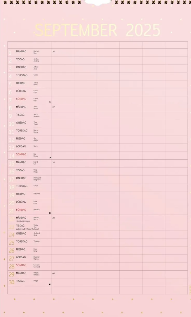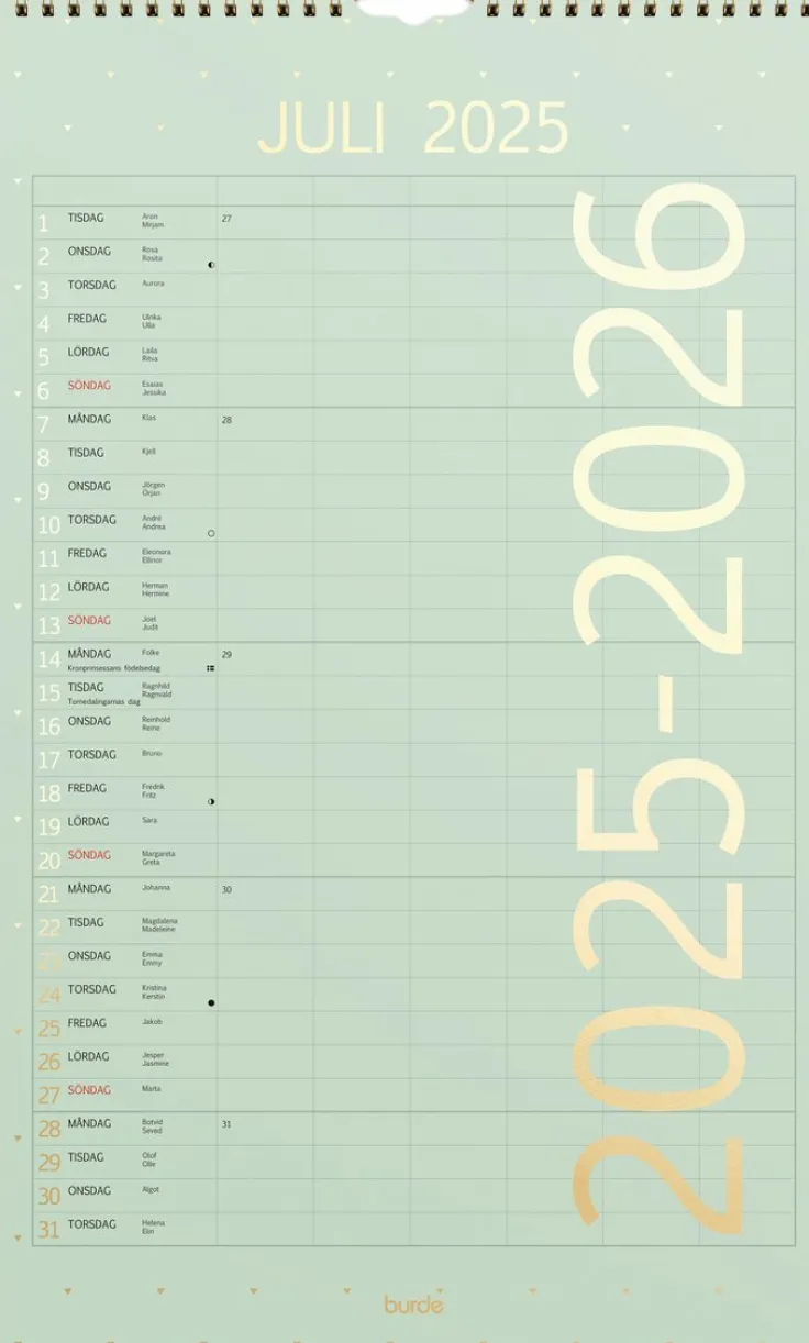 Ta kontroll över kalabaliken i vardagen med en familjekalender. Låt barnen fylla i sin egen kolumn och häng almanackan där alla ser den. På så sätt blir hela familjen delaktig i varandras planer och ni kan påminna varandra om vad som är på gång. Kalendern har sex kolumner och är designad i pastellfärger med lyxig guldfoliering, vilket gör den till en självklar mittpunkt hos varje familj!Familjekalender 25/26 från Burde. Format: 250×410 mm. Layout: Stående. Månad/uppslag. Kalendarium: 2025-07-01 – 2026-06-30. Omslag: Kartong. Spiralbunden. Innehåll: 6 kolumner. Antal sidor: 12. Miljöinformation: FSC®.