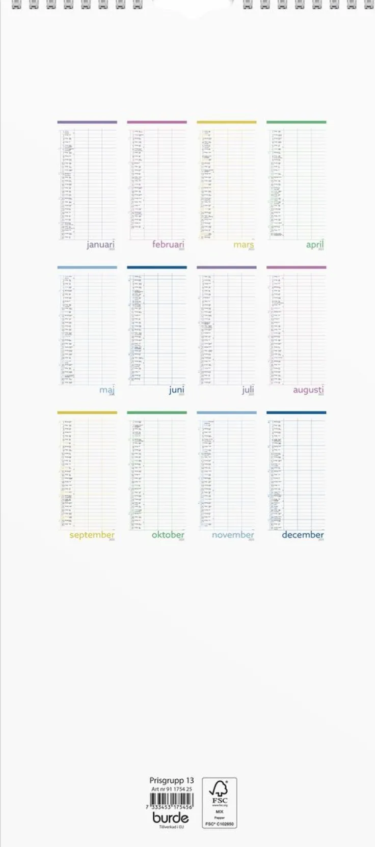 En vägghängd, gemensam familjekalender hjälper dig att frigöra tid för både familjemys och egentid. Kalendern är designad med en månad per sida, uppdelad i tre kolumner – perfekt för paret eller den lilla familjen. Gott om utrymme gör att alla planer får plats!Familjekalender 2025 från Burde. Format: 190×430 mm. Layout: Månad/blad. Kalendarium: 2025-01-01 – 2025-12-31. Spiralbunden. Innehåll: Tre kolumner. Antal sidor: 12. Miljöinformation: FSC®.