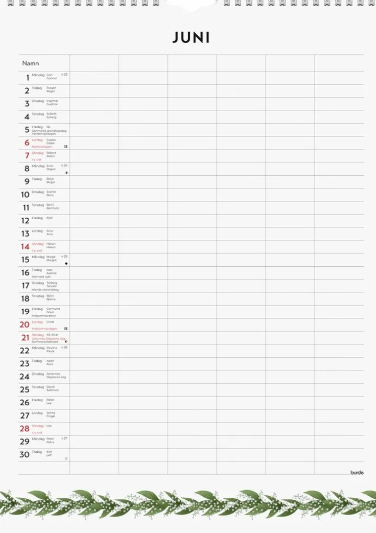Familjekalender 2026 från Burde. Format: A3. Layout: Månad/blad. Kalendarium: 2026-01-01 – 2026-12-31. Spiralbunden. Innehåll: Kyrkliga helgdagar, flaggdagar, helgdagar/aftnar, månfaser, namnsdagar, temadagar/händelser, årsöversikt/årsöversikter, 6 kolumner. Antal sidor: 12. Miljöinformation: FSC®.