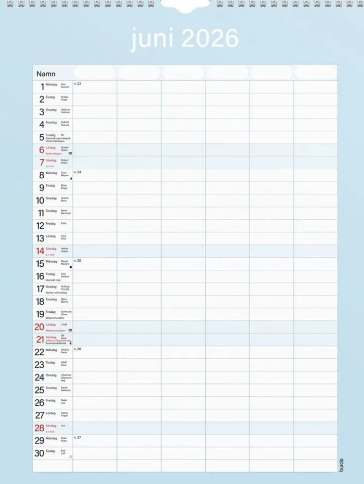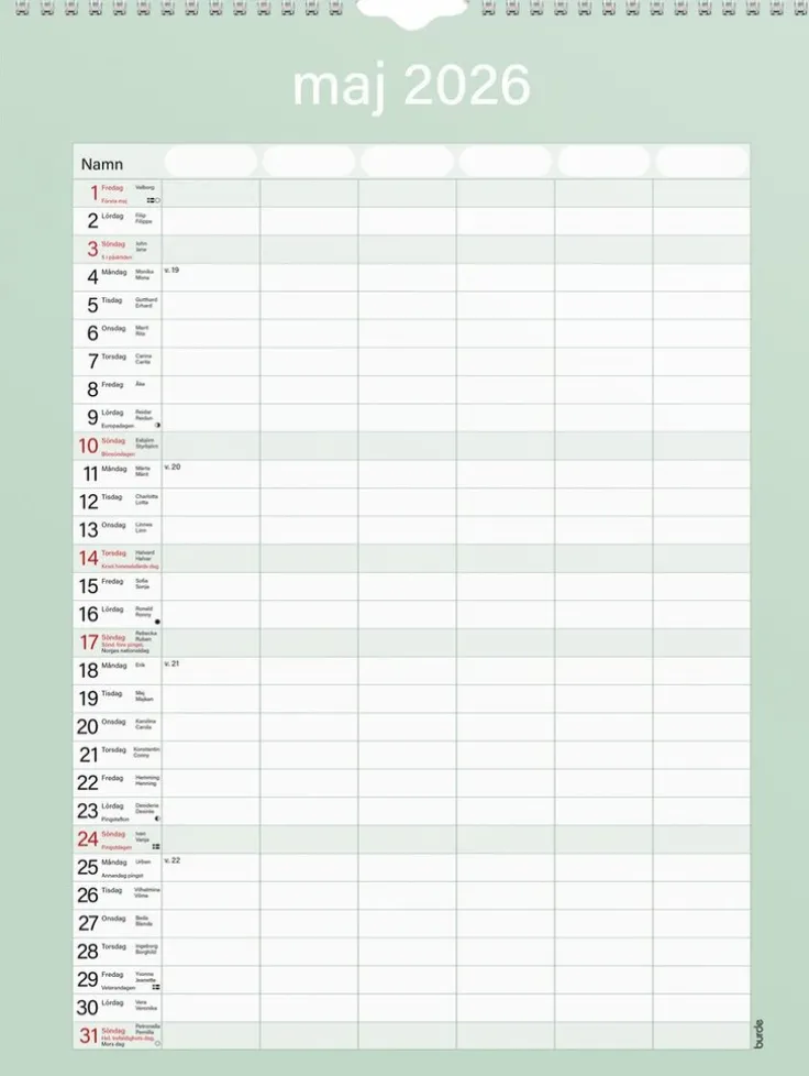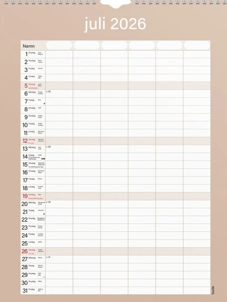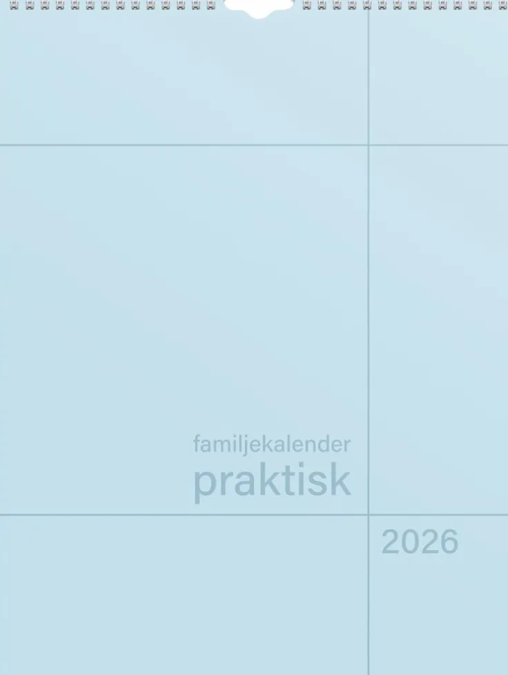 Familjekalender 2026 från Burde. Format: 295×390 mm. Layout: Månad/blad. Kalendarium: 2026-01-01 – 2026-12-31. Spiralbunden. Innehåll: Kyrkliga helgdagar, flaggdagar, helgdagar/aftnar, månfaser, namnsdagar, temadagar/händelser, 6 kolumner. Antal sidor: 12. Miljöinformation: FSC®.