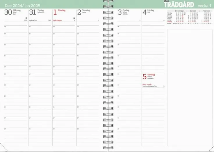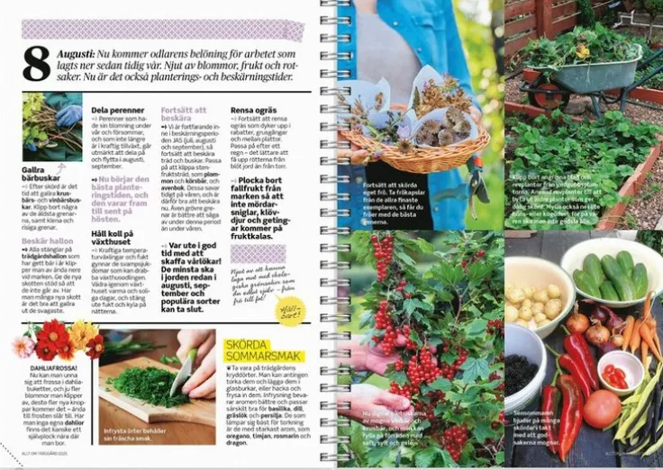 Tillsammans med tidningen Allt om Trädgård har Burde tagit fram en trädgårdskalender som hjälper dig att planera hela odlingsåret. Varje månad inleds med ett inspirerande uppslag där du får tips och påminnelser om vad som behöver göras i trädgården baserat på tiden på året, därefter följer vanlig klassisk veckoplanering. Det tåliga omslaget i plast gör att du kan ha med kalendern ut i odlingarna utan att innehållet skadas av jord och vatten. Planera smart och nå dina odlingsdrömmar!Kalender 2025 från Burde. Format: A5. Layout: Stående. Vecka/uppslag. Timindelning 8-18. Kalendarium: 2024-12-02 – 2026-01-04. Omslag: Återvunnen PP-plast. Spiralbunden. Detaljer: Gummiband. Innehåll: Årsöversikter, årsplaner Zonkarta över växtlighetszoner, Linjerade sidor. Antal sidor: 160. Miljöinformation: FSC®. Omslag i återvunnen PP-plast.
