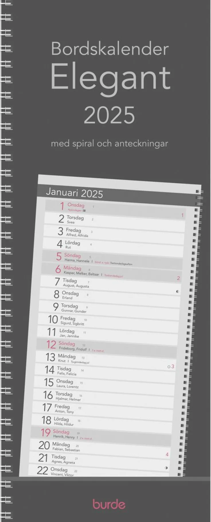 Kalender 2025 från Burde. Format: 115×295 mm. Layout: Månad/blad. Kalendarium: 2025-01-01 – 2025-12-31. Omslag: PP-plast. Spiralbunden. Innehåll: Årsöversikter, linjerade högersidor. Antal sidor: 25. Miljöinformation: FSC®.