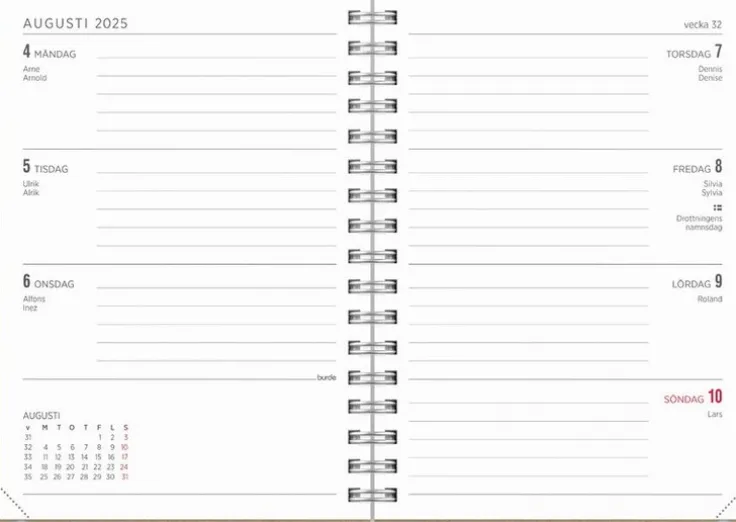 Enkel o stilren design tryckt på omslag i återvunnen kartong., folie tryck i silver som för höjer produkten. Ett praktiskt uppslag med liggande layout där fokus ligger på tydlig veckoplanering. Inlagans layout passar dig som har mycket på gång, oavsett veckodag. Kalendern är liten och enkel och med lika mycket utrymme för både vardag och helg.Kalender 2025 från Burde. Format: A6. Layout: Liggande. Vecka/uppslag. Kalendarium: 2024-12-09 – 2026-01-04. Omslag: Återvunnen kartong. Spiralbunden. Detaljer: Gummiband. Innehåll: Årsöversikter, årsplaner. Antal sidor: 144. Miljöinformation: FSC®. Omslag i återvunnen kartong.