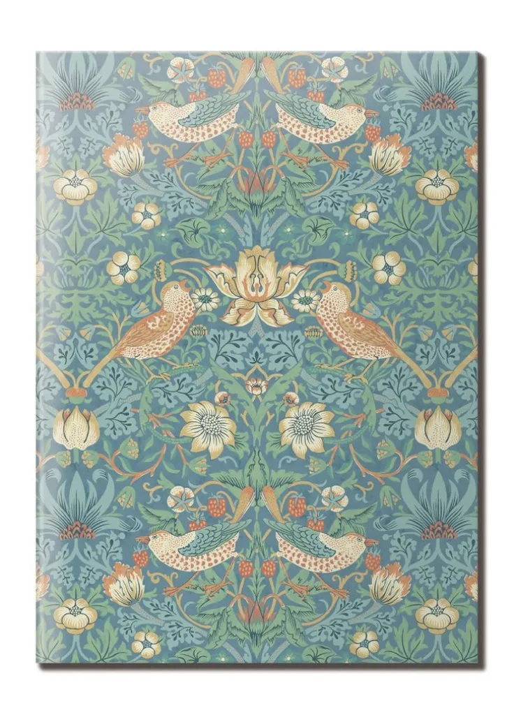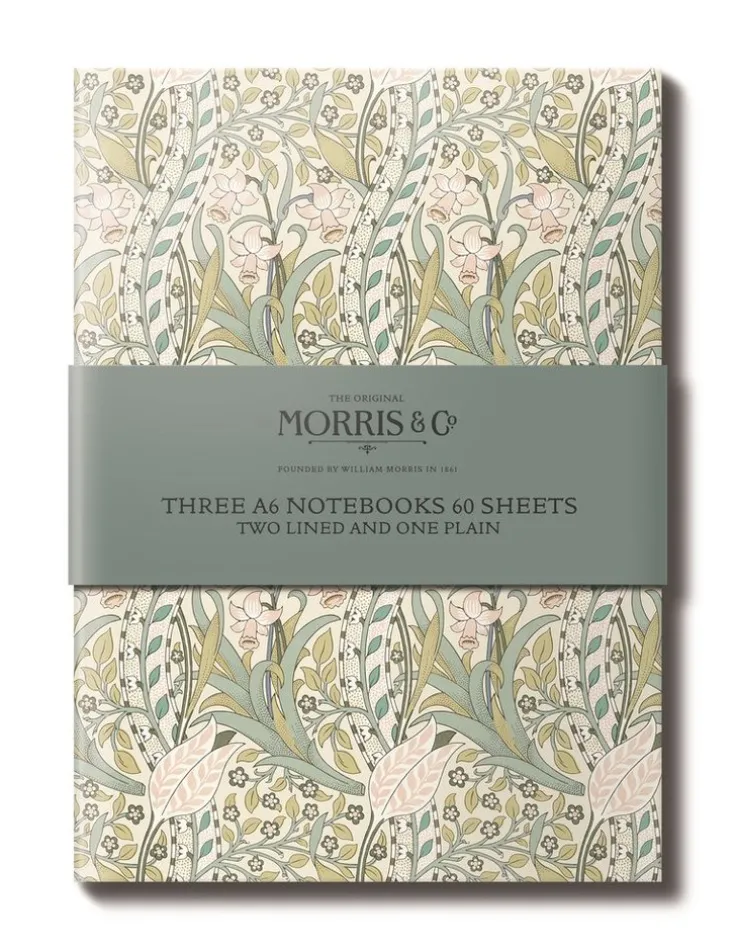 3 anteckningsböcker i 3 vackra mönster av William Morris: Daffodil, Strawberry Thief och Willow Bough. Varje anteckningsbok innehåller 60 blad och de är sydda i ryggen. 2 av anteckningsböckerna är linjerade och en är blank.