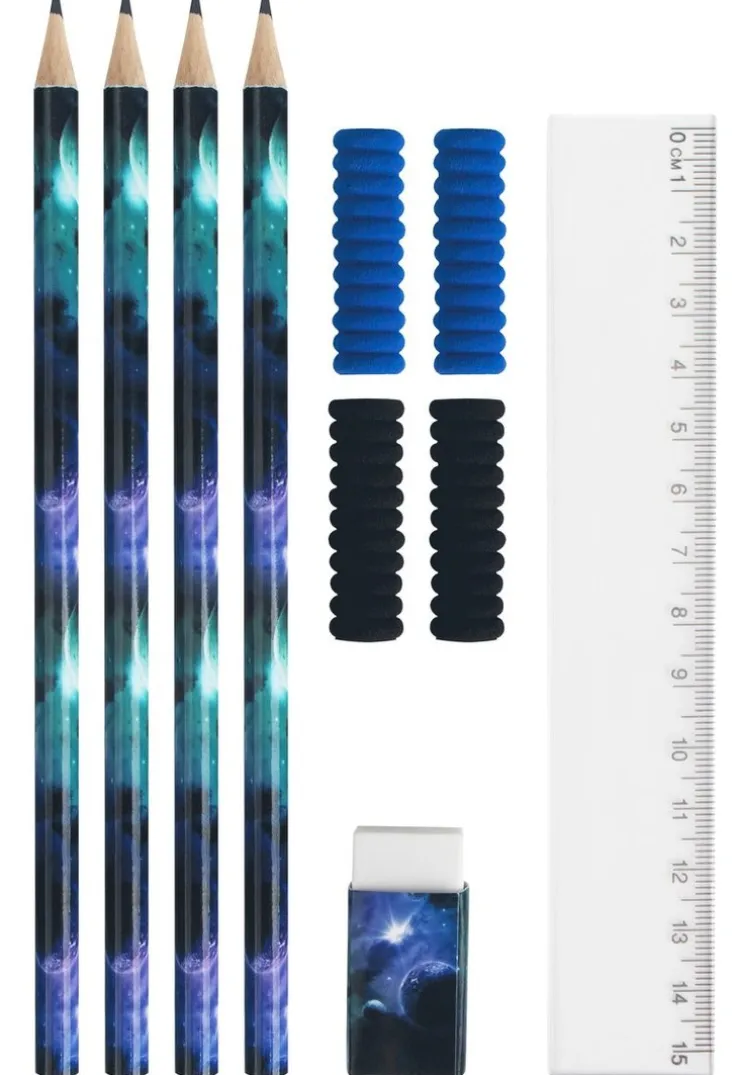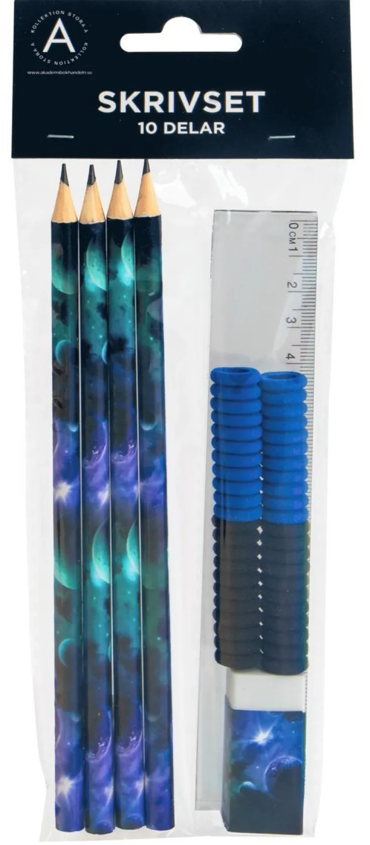 Pennset RYMDEN med fyra blyertspennor, en linjal, fyra penngrepp och ett sudd. Pennorna ligger stadigt i både små och stora händer, tack vare de smarta penngreppen. Medelhård blyertspenna: HB. Linjalens mått: 15 cm. Pennsetet innehåller totalt tio delar. CE-märkt. Pennsetet ingår i Akademibokhandelns egen kollektion – Kollektion Stora A.