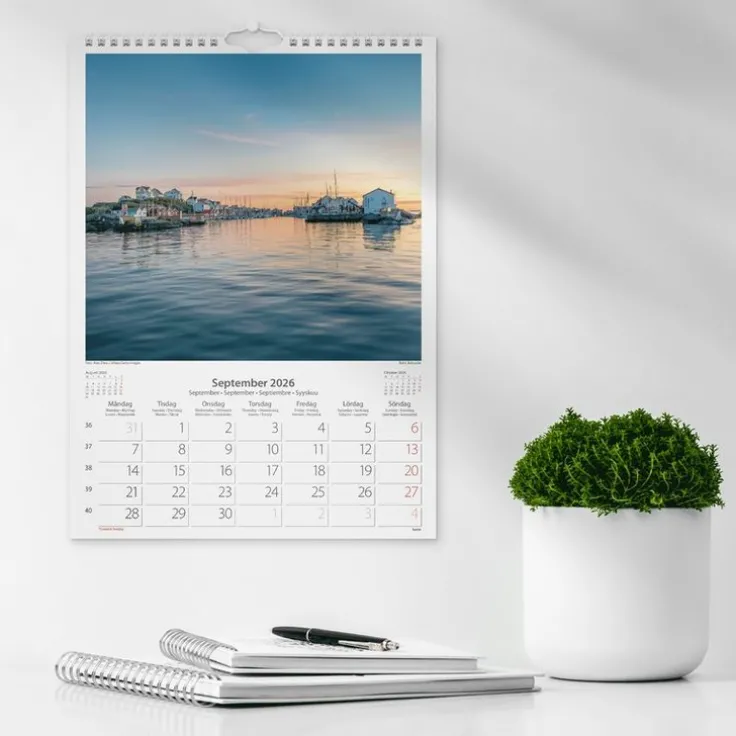 Väggkalender med tolv bilder från Sverige och svensk natur, den är femspråkig (svenska, engelska, tyska, spanska och finska).Väggkalender 2026 från Burde. Format: 330×455 mm. Layout: Månad/blad. Kalendarium: 2026-01-01 – 2026-12-31. Spiralbunden. Innehåll: Helgdagar, Internationella helgdagar. Antal sidor: 12. Miljöinformation: FSC®.