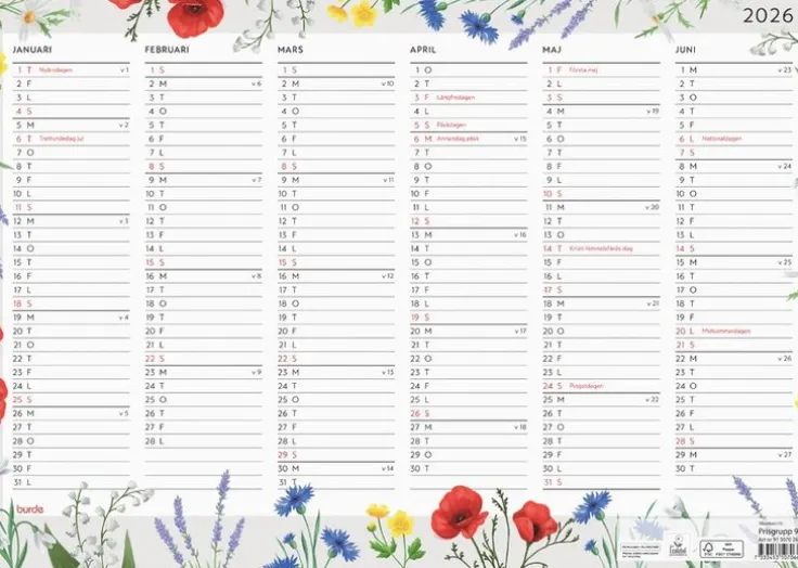 Väggkalender 2026 från Burde. Format: A3. Layout: Halvår/sida. Kalendarium: 2026-01-01 – 2026-12-31. Innehåll: Helgdagar, årsplan/årsplaner, anteckningssidor. Antal sidor: 2. Miljöinformation: FSC®. Ecolabel.