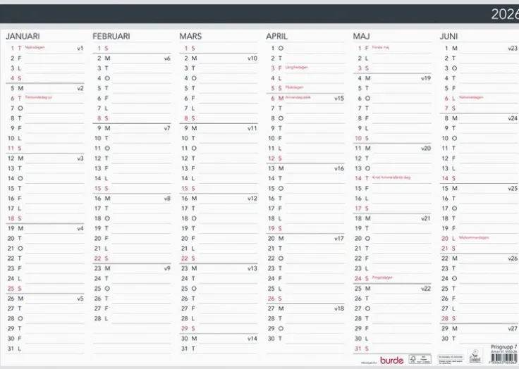 Väggkalender 2026 från Burde. Format: A3. Layout: Halvår/sida. Kalendarium: 2026-01-01 – 2026-12-31. Innehåll: Helgdagar, årsplan/årsplaner, anteckningssidor. Antal sidor: 2. Miljöinformation: FSC®. Ecolabel.